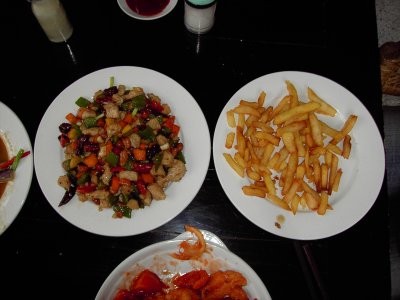 Chicken peanuts and french fries